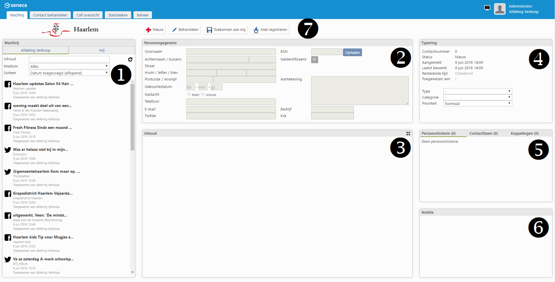 | 1 | Wachtrij | U ziet hier de wachtrij van binnengekomen berichten. Deze kunnen afkomstig zijn van zowel e-mail, als social media als andere bronnen. Klik op een bericht om dit te selecteren. |